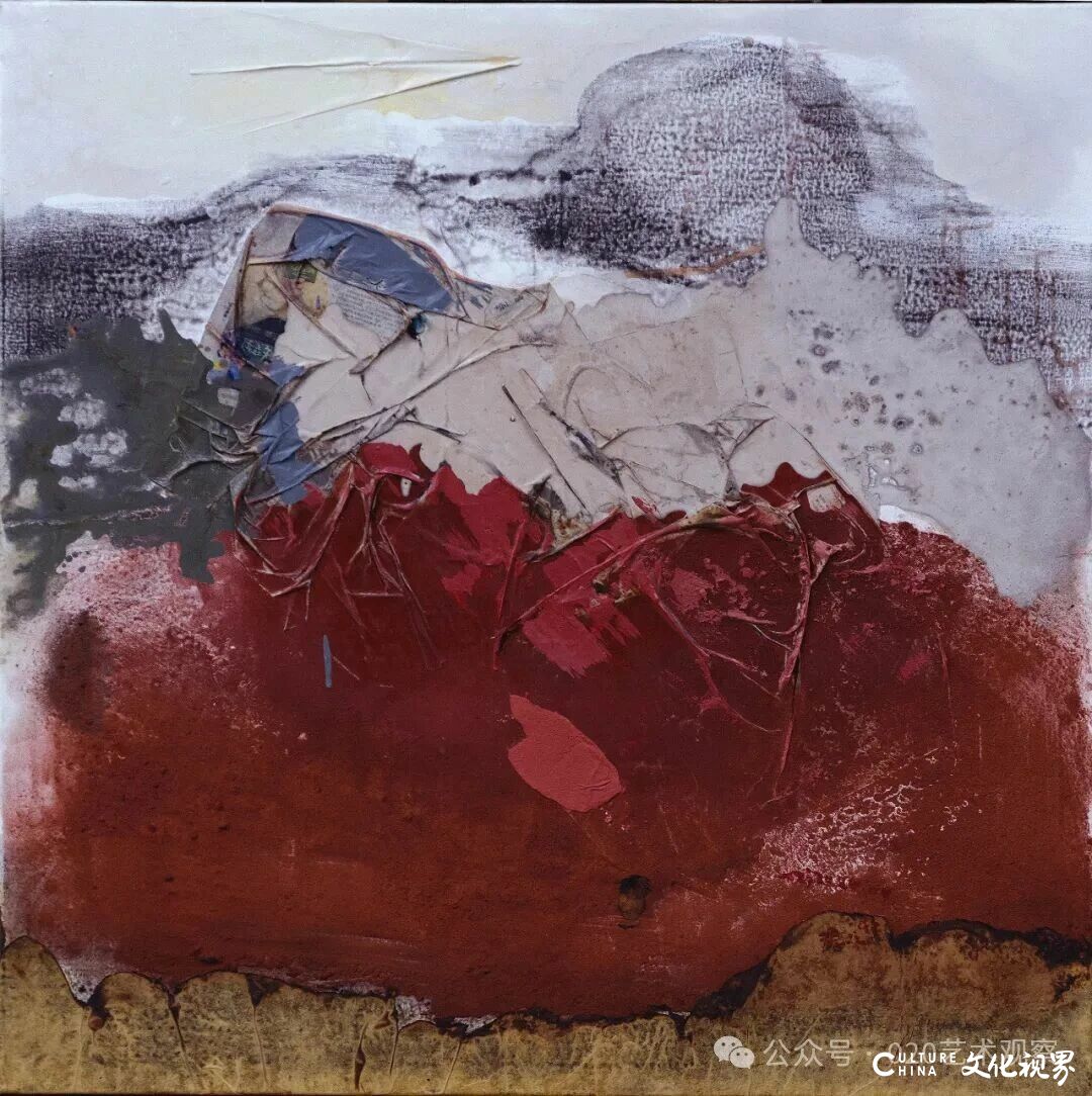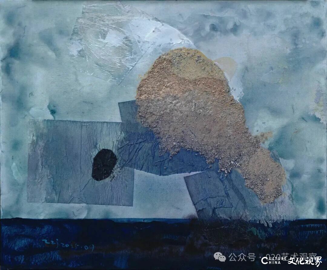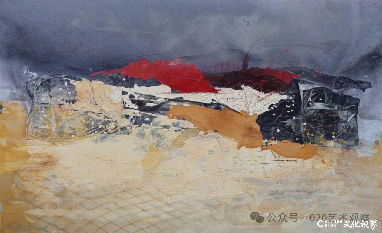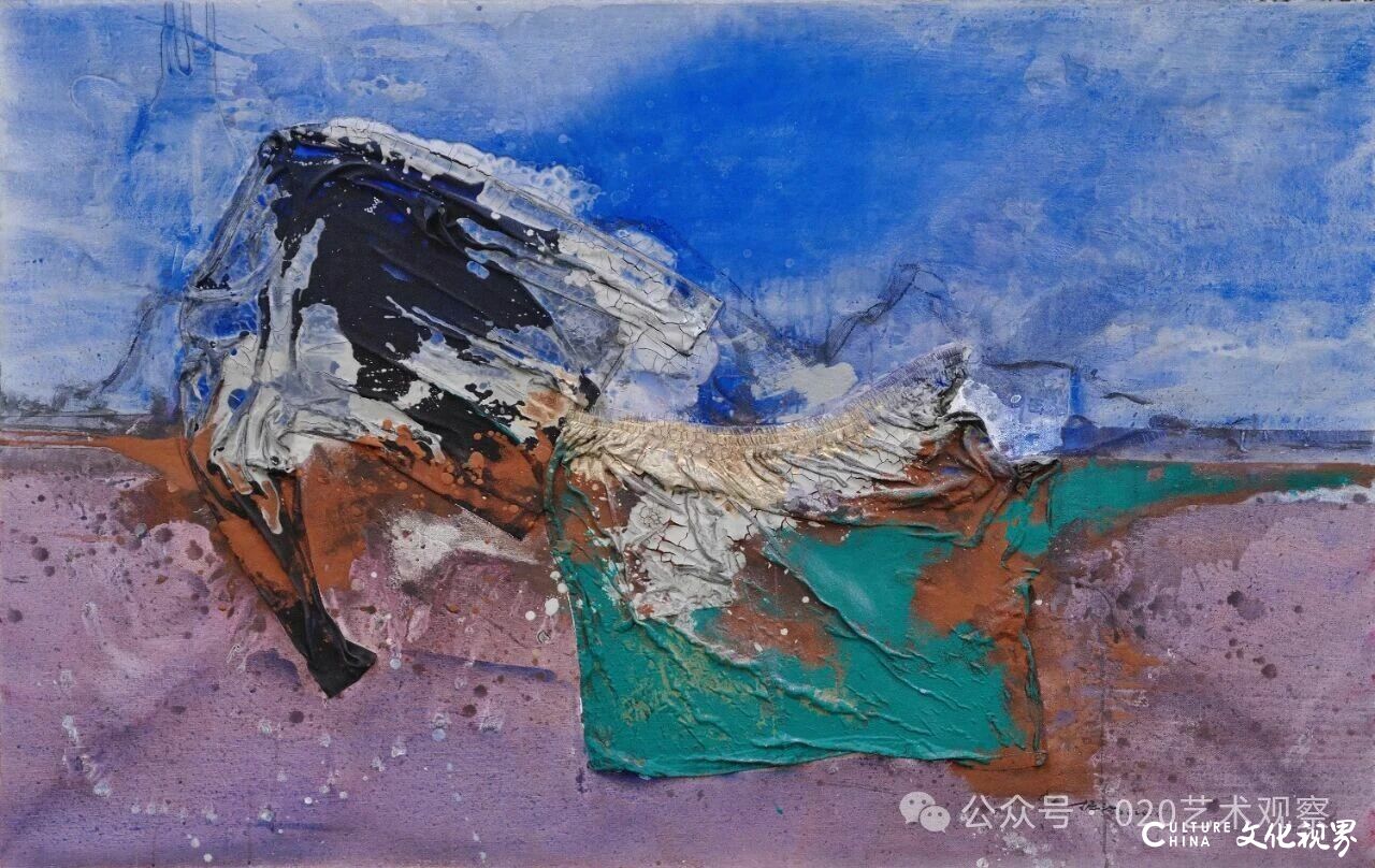 夏可君指出,张振江在作品中明确标注“水性综合材料”,却同时运用水彩、水墨、矿物质粉、沙土、铁皮等多种材质,形成了独特的“材质对抗与共生”:“他用水性材料的薄透、柔和,去平衡非水性材料的坚硬、粗糙——这种张力恰如南方艺术家对北方荒原的情感回应:既有对西部大地雄浑气质的敬畏,又保留了东方美学的温润诗意。”