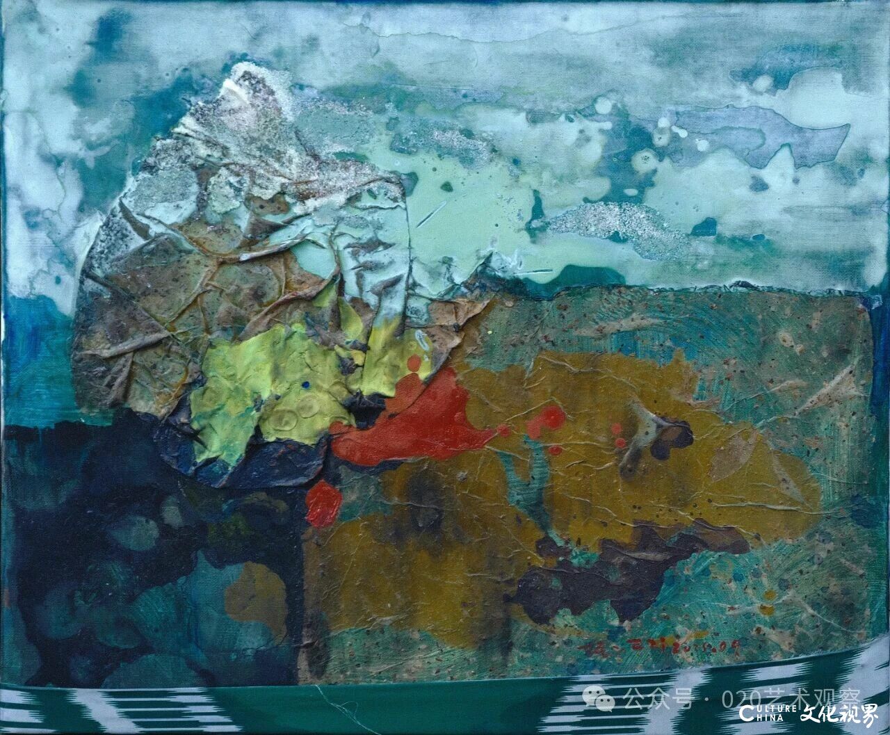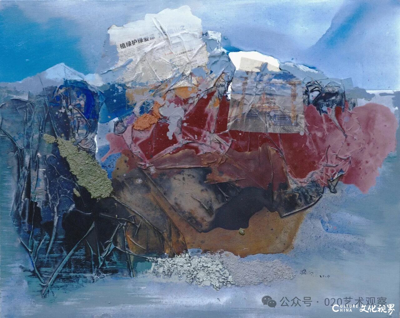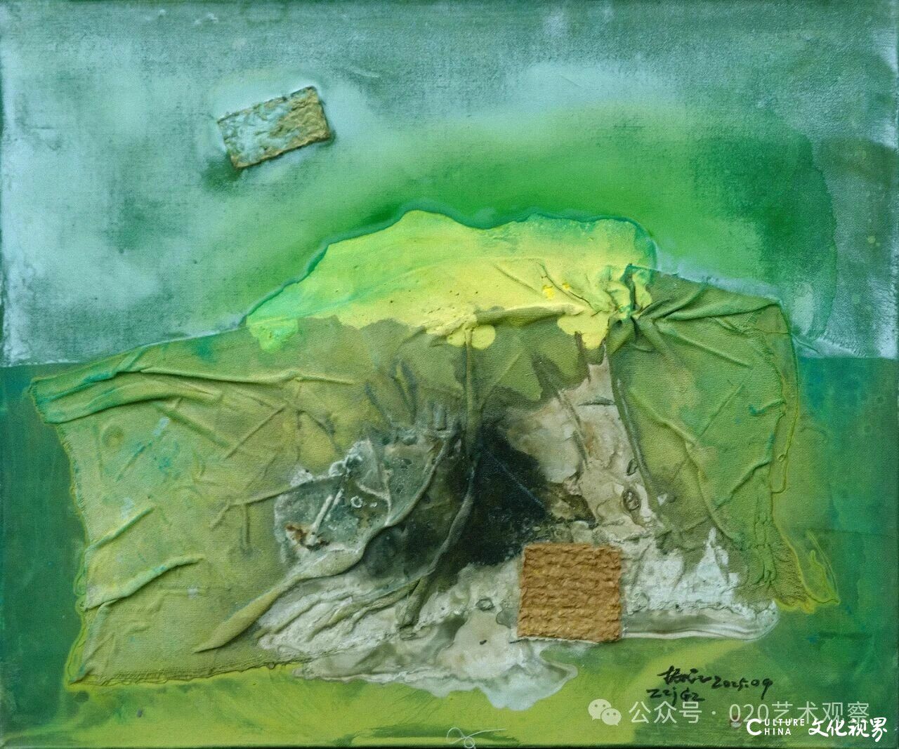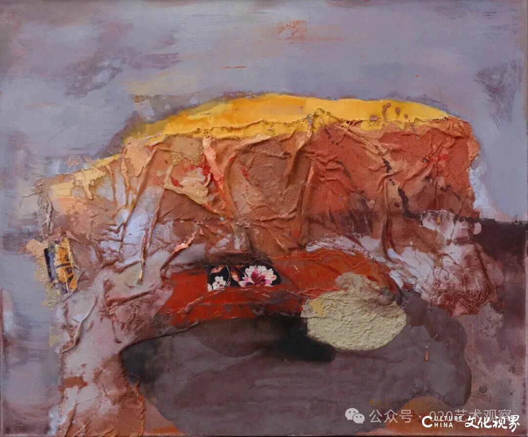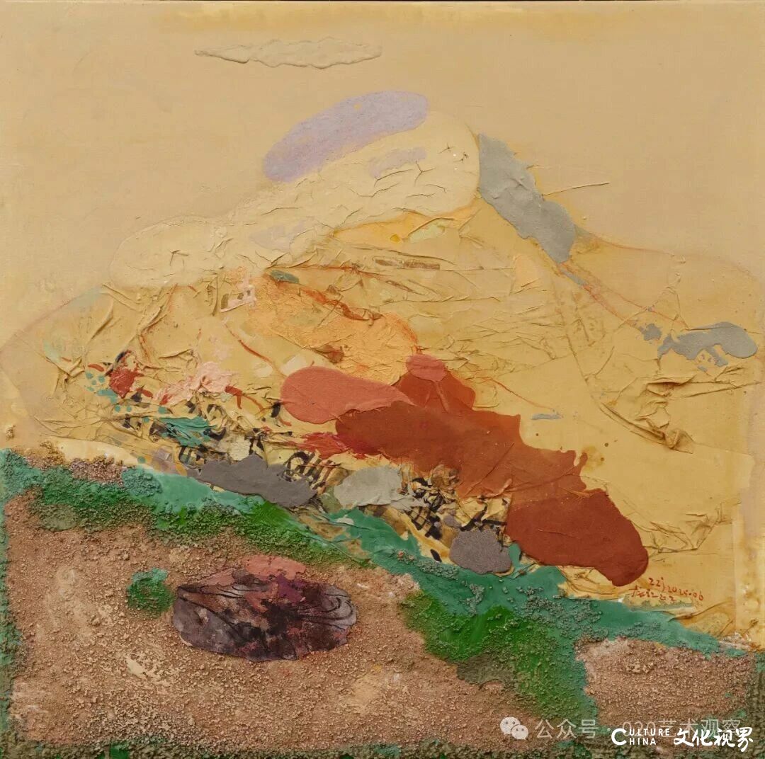 谈及“废墟与诗意的平衡”,夏可君以敦煌艺术为参照:“敦煌壁画在岁月侵蚀中形成的‘废墟感’,与张振江作品中荒原、岩石的意象有共通之处——但张振江没有停留在对‘残破’的呈现,而是通过色彩的叠加与材质的拼贴,在废墟感中提炼诗意。比如他作品的标题‘塞上燕脂凝夜紫’‘新绿破春寒’,本身就带着古典诗词的意境,让坚硬的材质有了柔软的情感温度。”