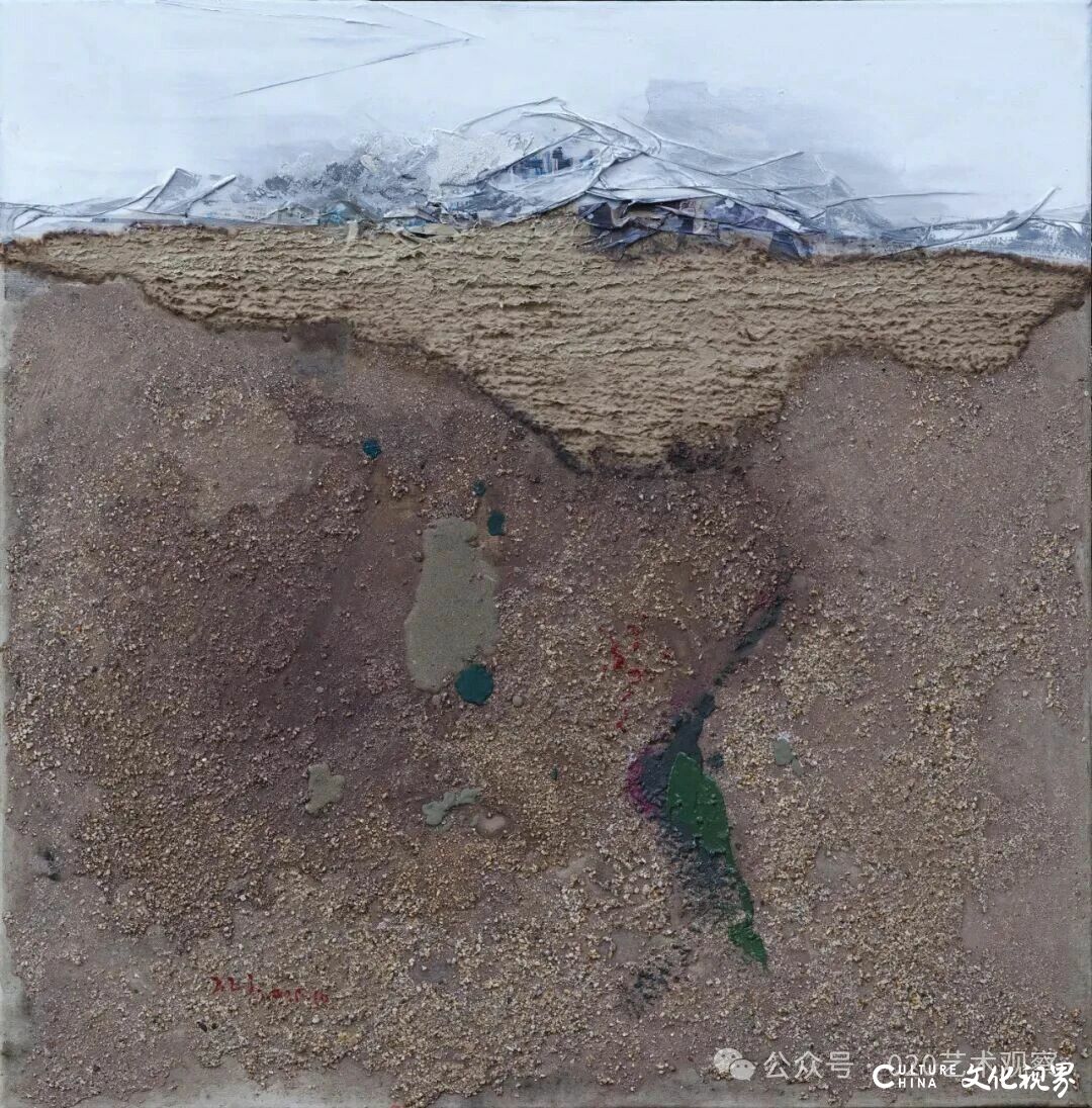 张国龙指出,张振江的创作有明显的“生长性”——“他不是先设定构图,而是让材料自然流淌、生长,在创作过程中不断调整,这种‘随物赋形’的方式,让作品有了生命力,避免了机械的形式拼接。同时,他实现了‘化物质’的突破——不是将‘想法转化为物质’,而是让‘物质本身成为表达’,比如沙土的粗糙、水彩的温润,本身就在传递情感,无需额外的符号解释。”